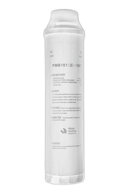 PMB10(2)-10F – tai 10 colių standartinio dydžio filtro kasetė su jonų mainų derva, skirta vandens kietumo mažinimui. Idealiai tinka atvirkštinės osmozės (RO) sistemoms, vandens minkštinimo įrenginiams ir standartiniams filtravimo korpusams.