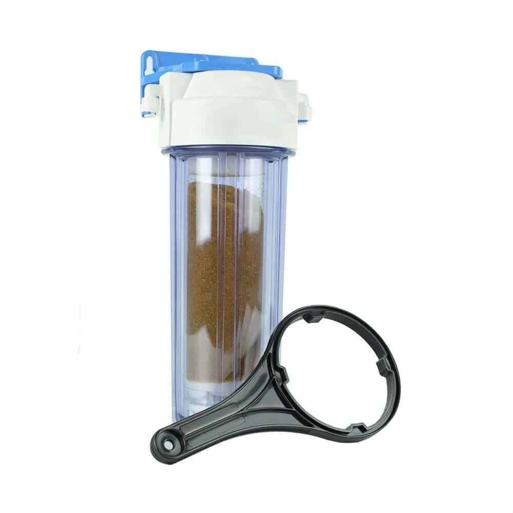 Skaidrus 10 colių korpusas su konteineriu demineralizacijos terpei (gali būti lengvai keičiamas).