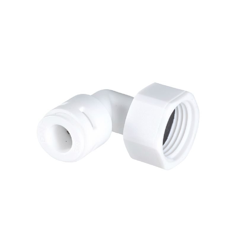 “L” formos alkūnė su vidiniu sriegiu: 3/8″ vamzdžio x 1/2″ vidinio sriegio jungtis.