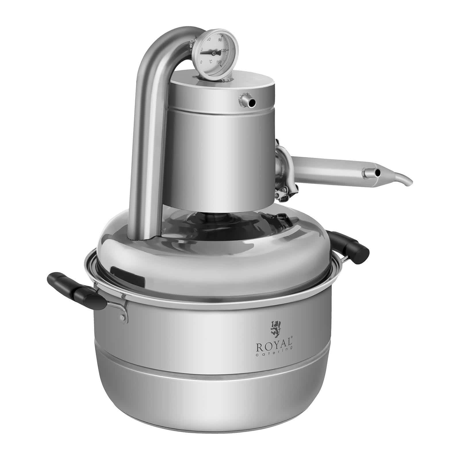 Distiliatorius tinka vandens ir hidrolatų distiliavimui. Su 10 litrų talpa galite distiliuoti didelius kiekius. Virdulys pagamintas iš specialaus storio nerūdijančio plieno. Siekiant gauti pageidaujamą kokybę, būtina stebėti temperatūrą. Dėl šios priežasties įdiegtas lengvai suprantamas analoginis termometras. Jis tiksliai rodo temperatūrą 0-150 ° C.